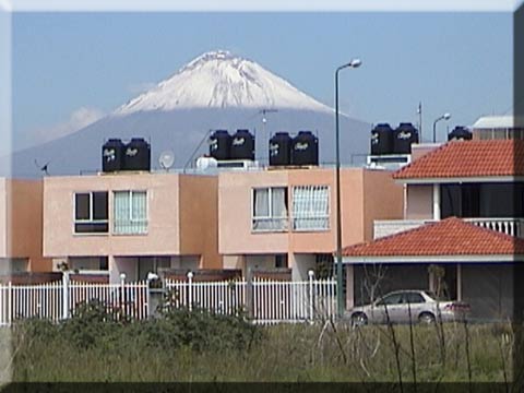 "El Pilar" Suburb. The black containers on top of the houses are for water storage. The volcano Popocatepetl (17,925 feet) is on the background.