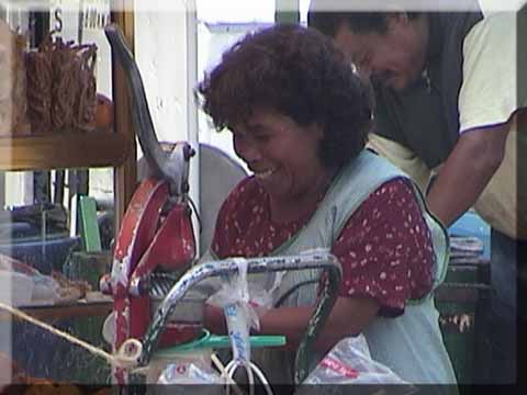 Lady selling fruit, chips, and fresh orange juice in the street near "Finanzas"